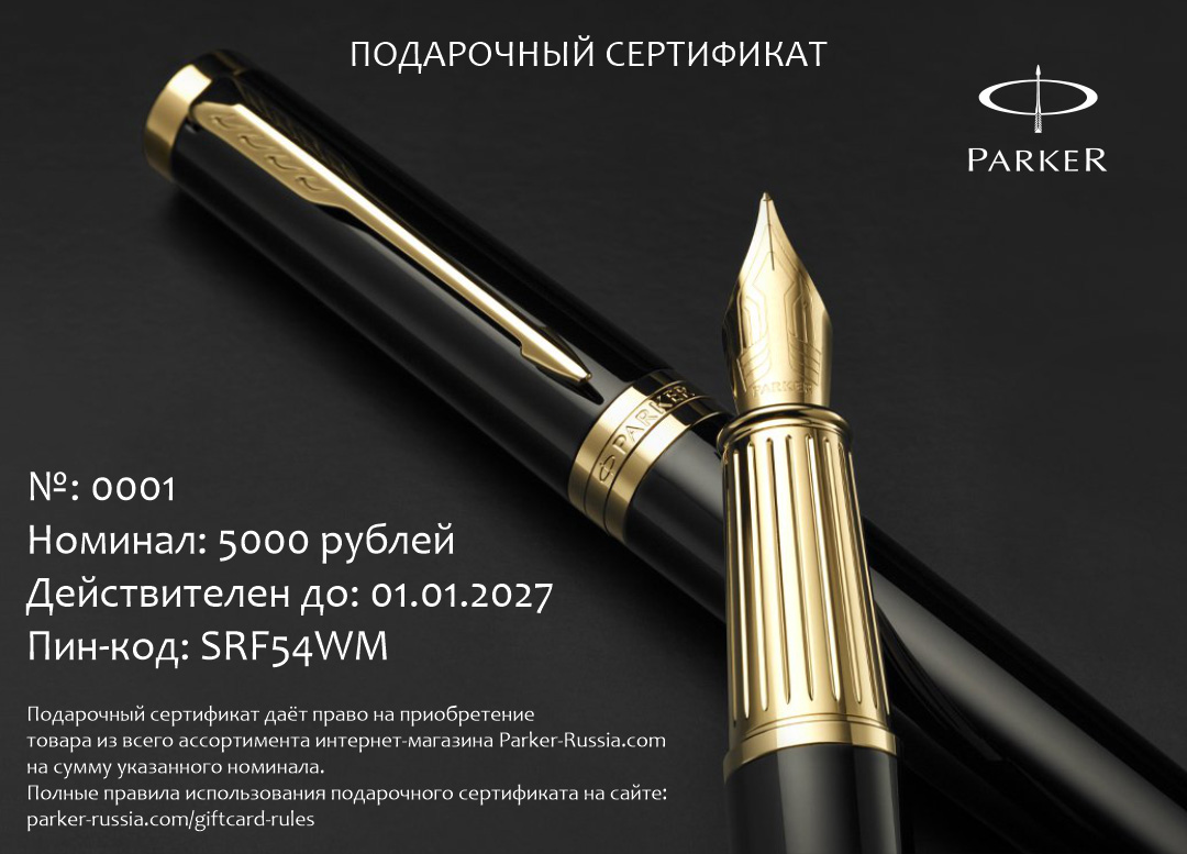 Подарочный сертификат Parker 15000 от официального дилера Parker в Сочи. Вы можете дополнительно заказать гравировку, которая подчеркнет Вашу оригинальность и придаст памятность статусному подарку. Все ручки Паркер поставляются в фирменном футляре.